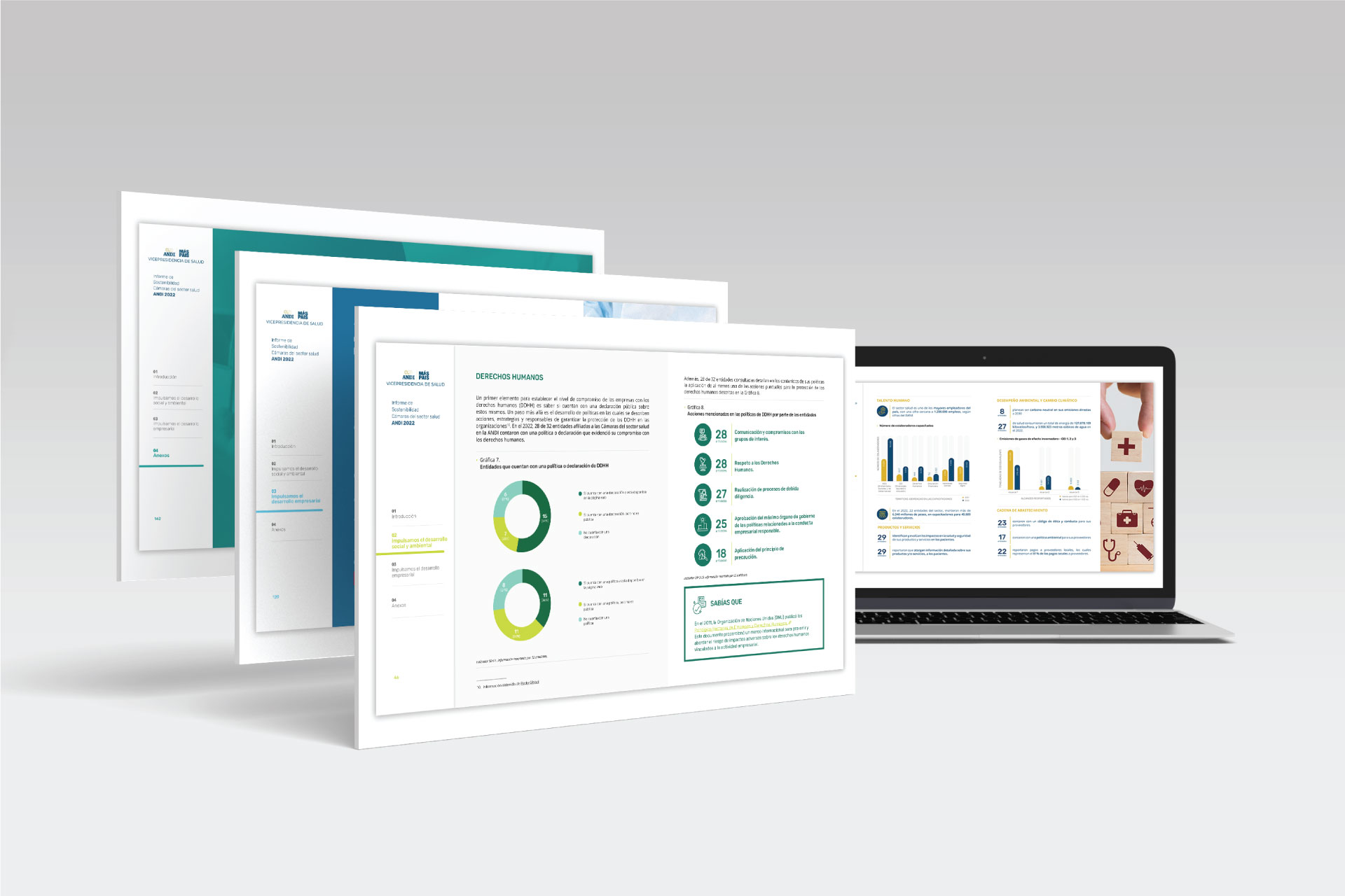 Diseño de documento editorial en formato digital, para el Informe de las cámaras del sector salud de la ANDI. Este informe consolida las respuestas